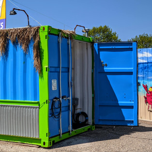 This is a cool new twist on portable snow cone shacks. This unit is a 20' container that the owners have outfitted with attractive paint, cool ocean vibes, and smart advertising. Behind this bright beacon of tasty treats is a steel gate that matches the steel pattern on the container. It is cheerfully painted with ocean scenes and friendly characters.